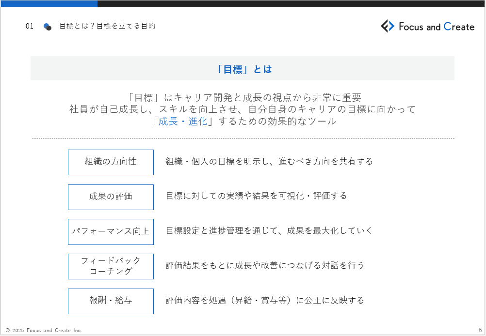 「何ができるようになれば”成長”と言えるのか」が見えるため、