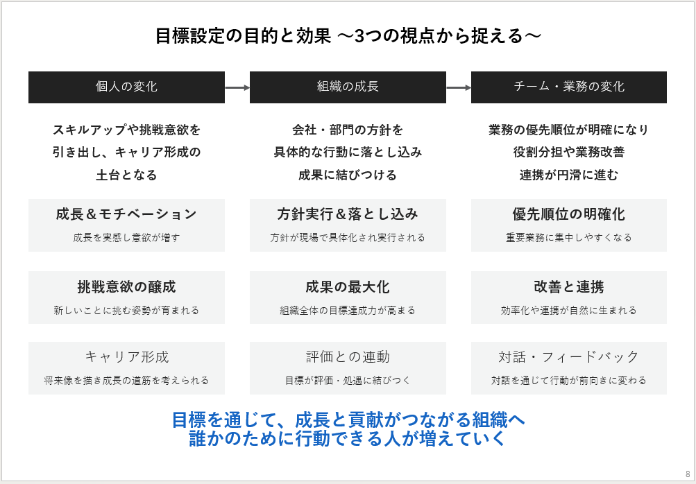 ■目標の目的と効果 – 個人も組織も前に進みやすくなる